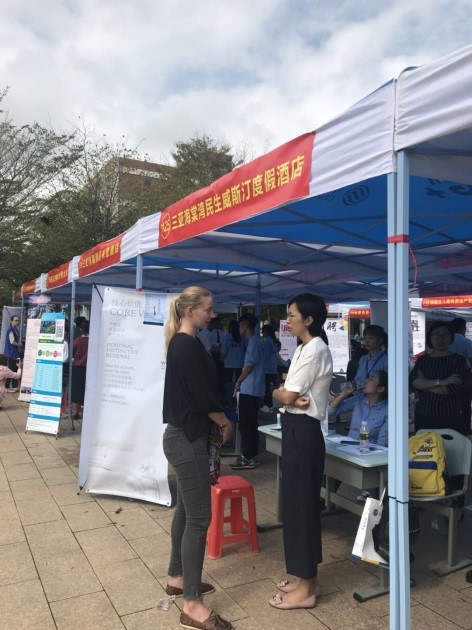 本次招聘会第二大亮点特色鲜明。本次招聘会共有240个助聘员穿上统一印制“海经贸志愿者”统一浅蓝色着装,分两排站在通道两旁欢迎企业代表。11点半,每位助聘员为前来招聘的企业代表送工作餐并以企业代表一同就餐,企业代表像回到了家一样,谈笑中既温暖又延续了招聘工作。